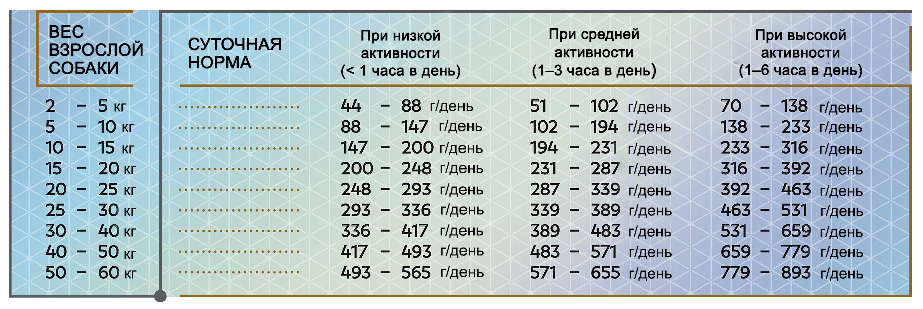 Нормы кормления: смотреть таблицу. Количество, указанное в таблице, носит рекомендательный характер. Рацион регулируется в соответствии с индивидуальными потребностями собаки.