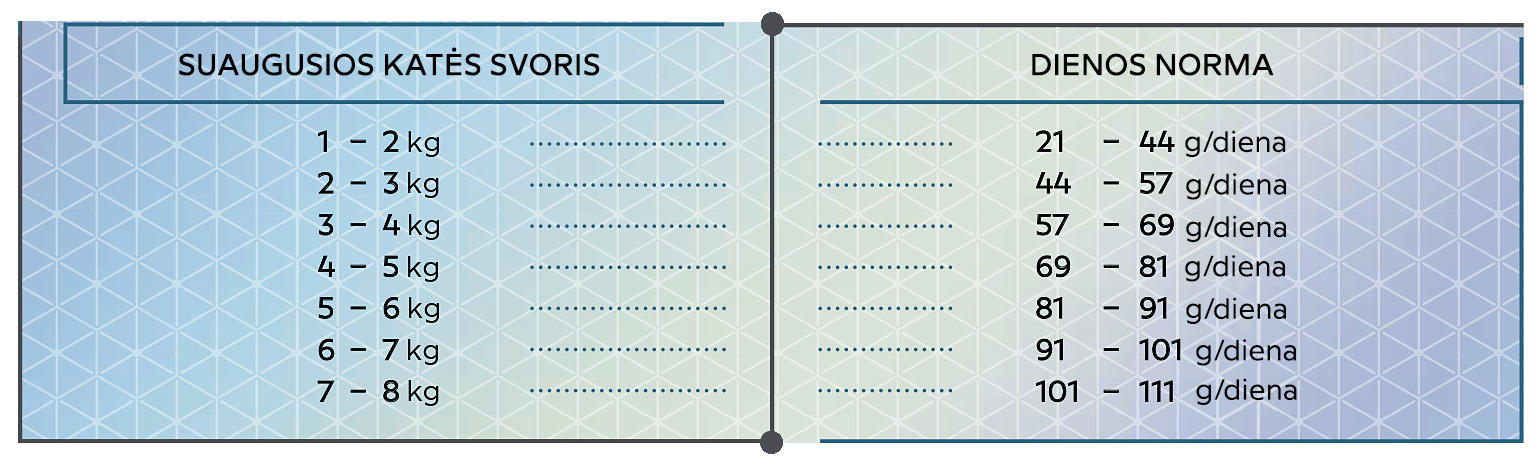 Šėrimo norma: žr. lentelėje. Lentelėje nurodytas tik rekomenduojamas pašaro kiekis. Kiekis turėtų būti keičiamas atsižvelgiant į atskirus kiekvienos katės poreikius.
