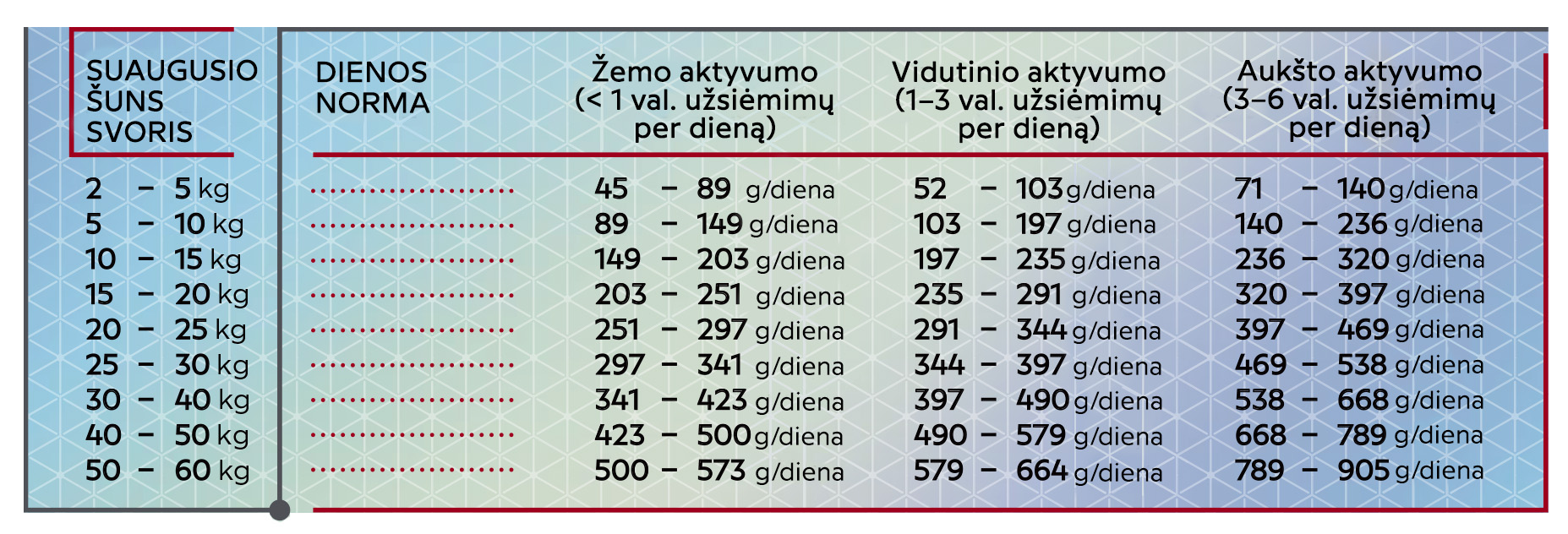 Šėrimo norma: žr. lentelėje. Lentelėje nurodytas tik rekomenduojamas pašaro kiekis. Kiekis turėtų būti keičiamas atsižvelgiant į atskirus kiekvieno šuns poreikius.